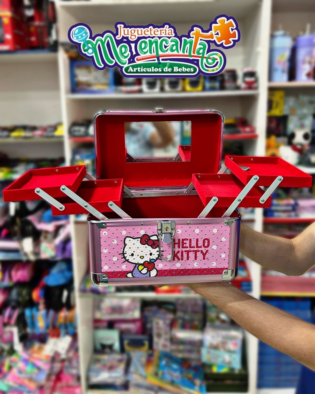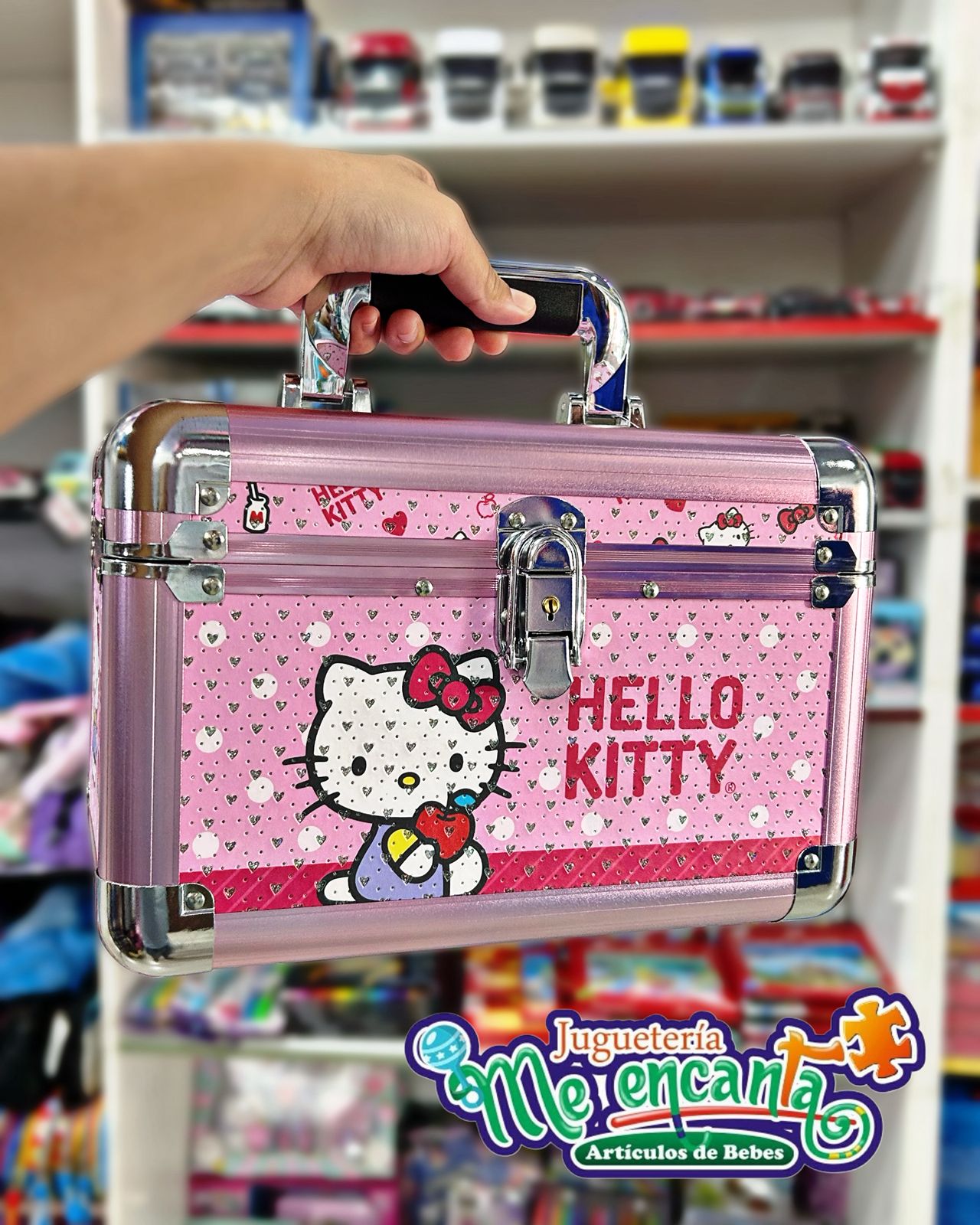 - Diseño: Maletín metálico con diseño de Hello Kitty, a menudo con interiores de terciopelo y espejos integrados.