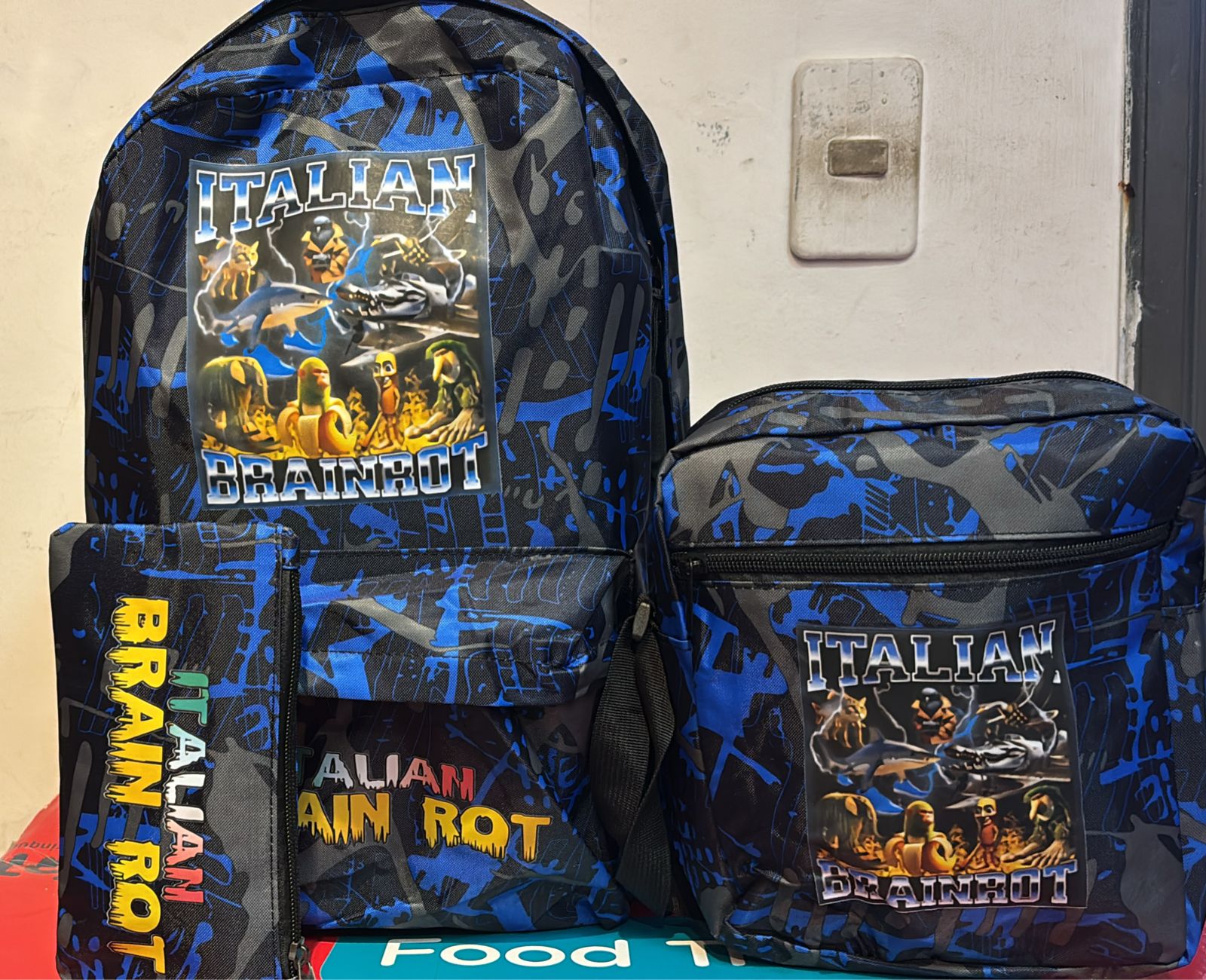 Este es un juego de tres mochilas temáticas «Italian Brainrot» que incluye una mochila grande, una lonchera y un estuche para lápices.