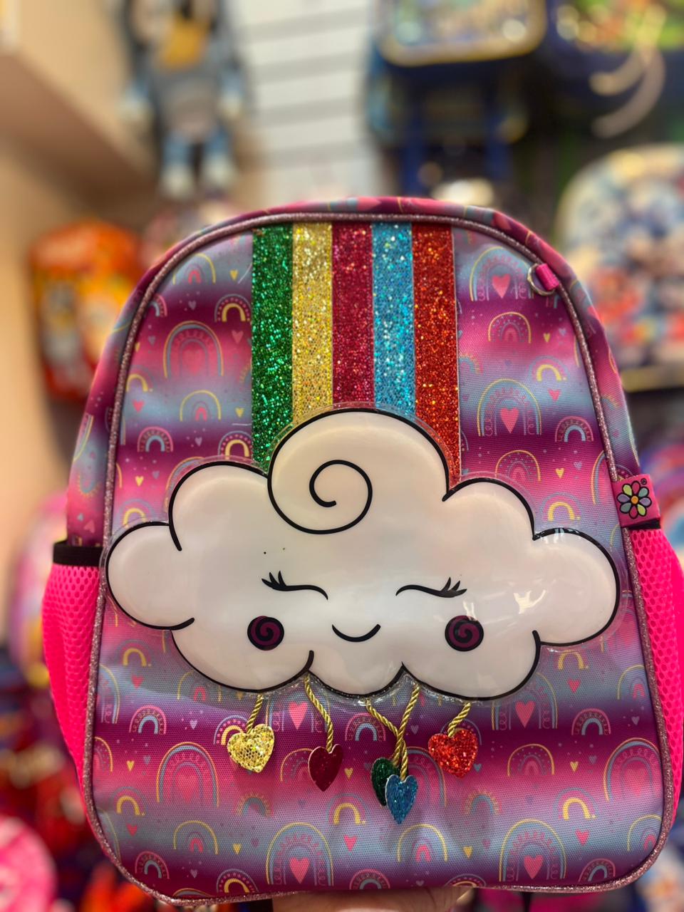 Presenta un estampado colorido con un fondo degradado de morado a fucsia, una nube blanca sonriente y tiras de purpurina (glitter) que simulan un arcoíris. Tiene pequeños dijes colgantes con forma de corazón y nube en la parte inferior de la nube principal.