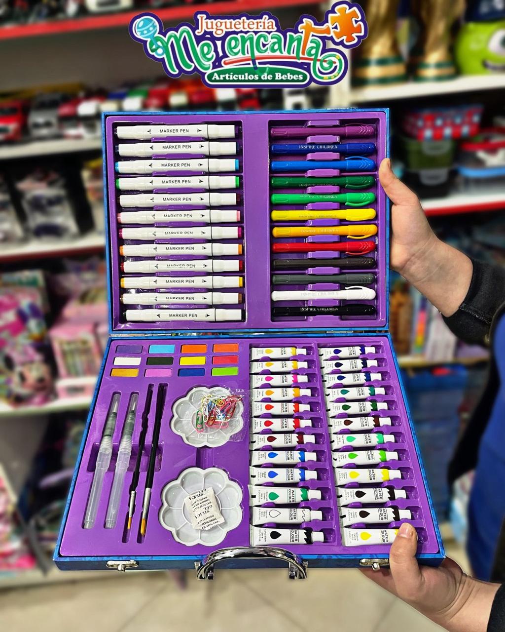 Es un estuche escolar infantil, a menudo identificado como un set de arte de 88 piezas. Este tipo de productos suele incluir una variedad de materiales para dibujo y pintura, tales como marcadores, pinturas en tubo (acuarelas o acrílicos), pinceles y paletas de mezcla.